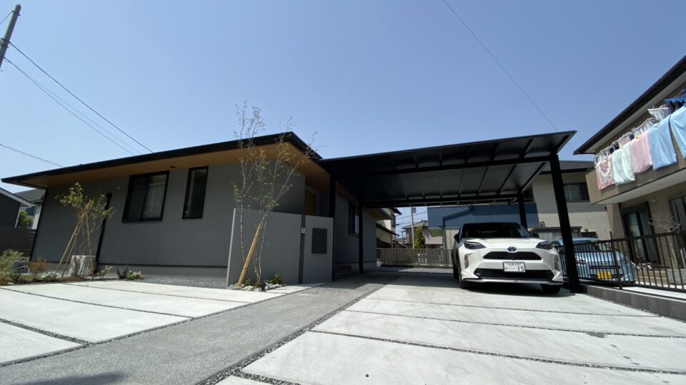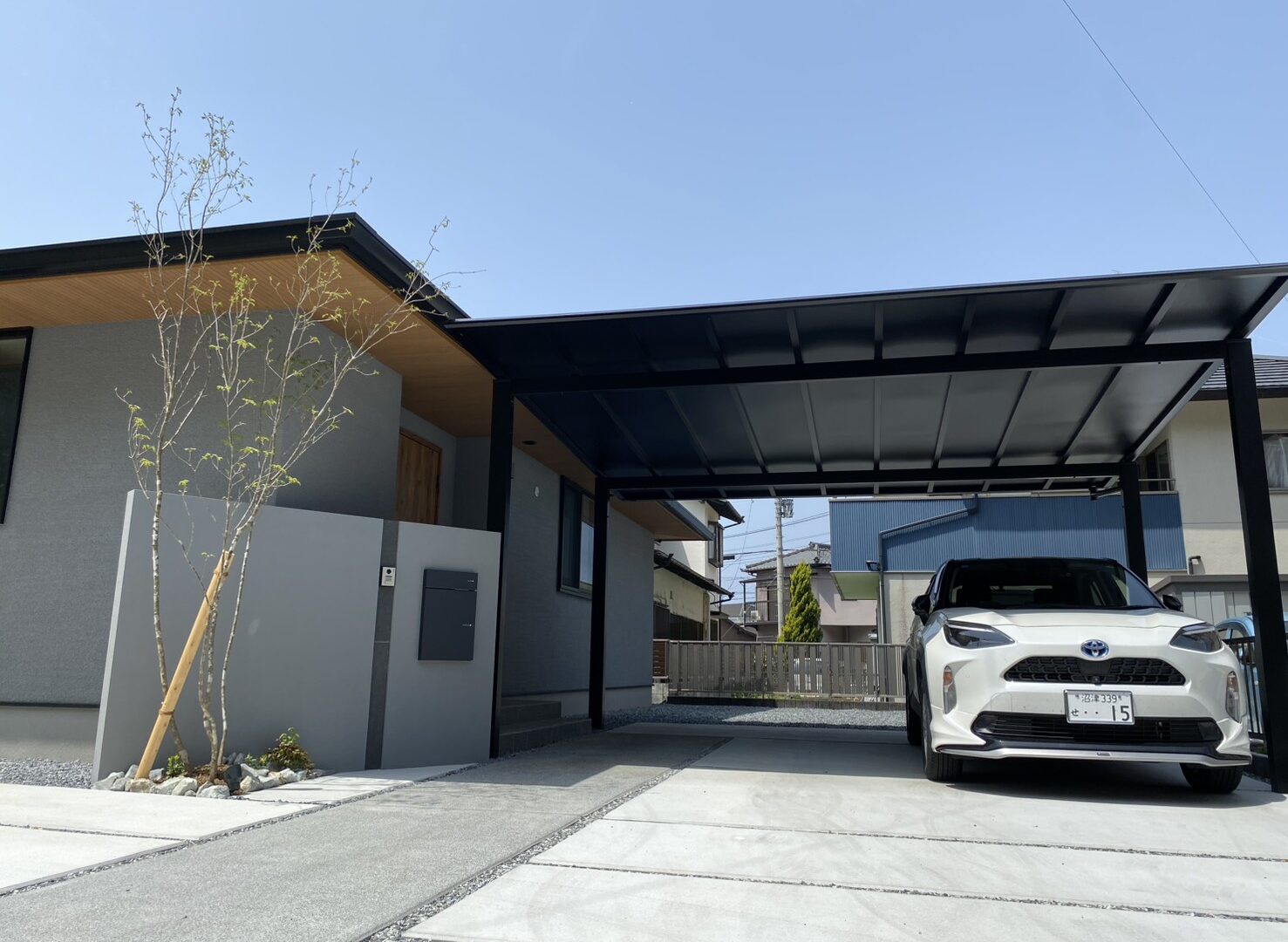 建物に合わせて、カーポートやコンクリートの目地などを水平にデザインしました。